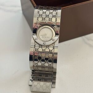 Stylish Gucci watch with silver finish. Features signature GG logo design.
