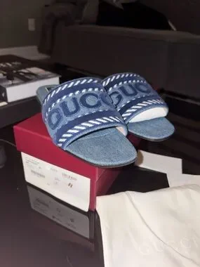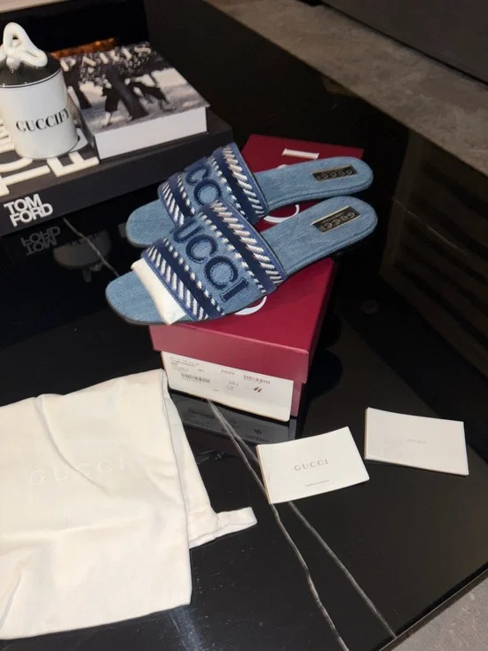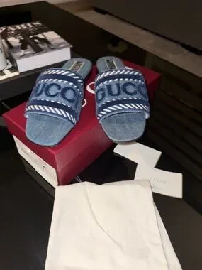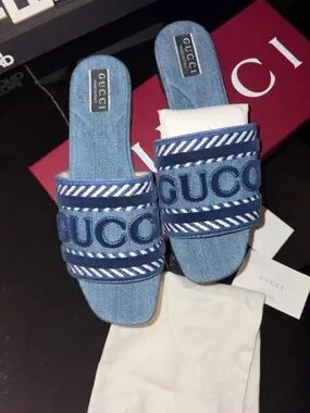 Gucci denim slide sandals with prominent logo across the straps. Light blue denim upper with white woven accents. Open toe slip-on design. Casual luxury for everyday wear.