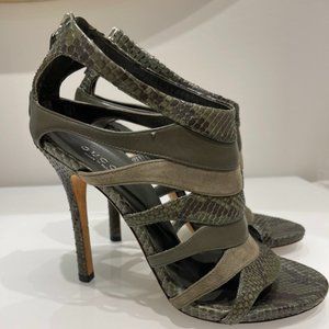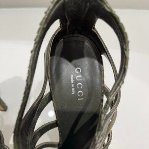 AUTHENTIC Gucci Snakeskin sandals with leather trim embellishment and suede trim. Stiletto heels with platform. Multistrap and concealed zip closure at ankles. Heel height 4.25"