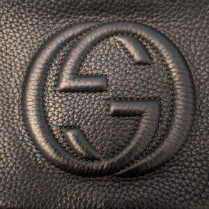 Iconic Gucci Soho Disco crossbody bag in black pebbled leather with the signature interlocking GG logo embossed on the front. Features a top zip closure with oversized leather tassel pull, gold-tone hardware, and adjustable leather strap. Lightweight, versatile, and timeless — this is one of Gucci’s most sought-after everyday bags.