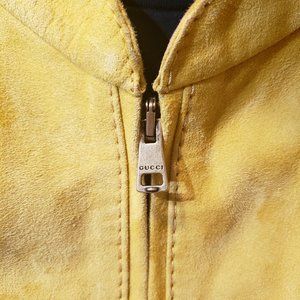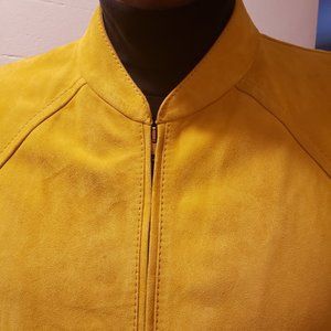 Yellow heavy suede with stretch cotton ribbed trim. Unlined. Zip closure. Two front pockets. Mandarin collar. Made in Italy.