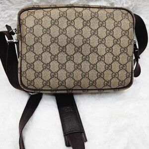 It includes a front zip pocket, an adjustable brown nylon crossbody strap with a shoulder pad, and silver-tone hardware.