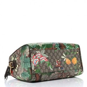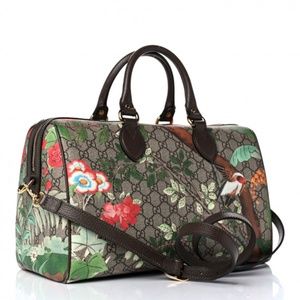 This is an authentic GUCCI GG Supreme Monogram Tian Medium Top Handle Bag in Maple Brown. This stunning handbag is crafted of Gucci GG monogram coated canvas. The bag features vibrant floral designs, leather top handles, an optional shoulder strap, and brass hardware. The top zips open to a coarse fabric interior with zipper and patch pockets. This is a marvelous handbag, ideal for everyday use, from Gucci!