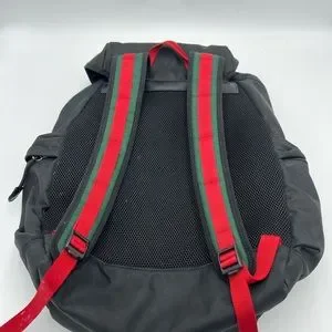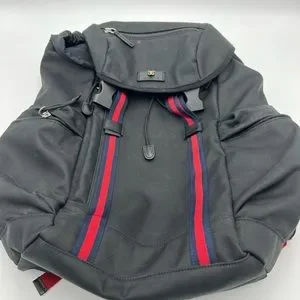 Finish and colour: Black technical canvas fabric with blue and red web and a leather Gucci tag with a metal feline detail