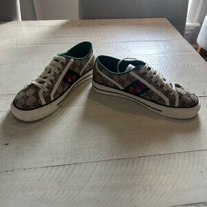The low-top sneaker is presented in Original GG canvas in its classic color combination of beige and ebony. The style combines different elements from the House's heritage such as the Gucci Tennis 1977 label, a textured GG motif at the sole and the Web—details which recall the House's connection to the world of sports and leisure.