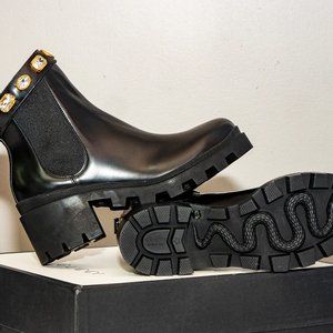 An unexpected play on the classic Chelsea boot, this ankle boot in shiny black leather is designed with a lug sole and elastic inserts on each side for a pull-on entry. Completed with a detachable ankle strap dotted with sparkling crystals encased within engraved trims, resembling vintage jewels. The emblematic Double G finishes the front.