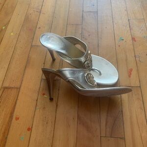 Chic Gucci sandals in metallic gold. Features iconic logo detail. Ideal for stylish outings.