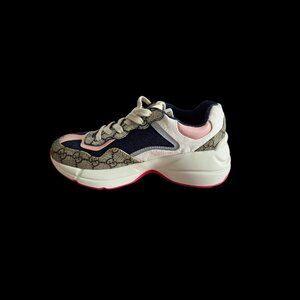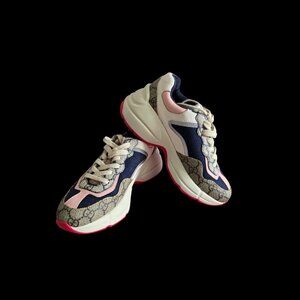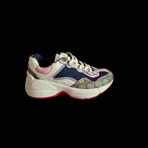 Chic Gucci sneakers with a stylish beige, pink, and navy design. Perfect for casual wear. Worn only once.