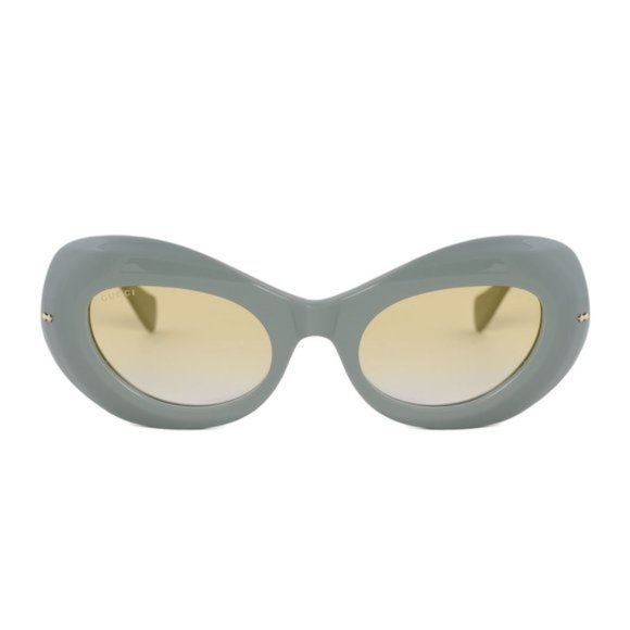 Gucci's design philosophy has consistently embraced sophistication, and this innovative addition to its lineup continues to exemplify this principle. The oval oversized frames encapsulate a cat-eye shape, meticulously crafted from elegant grey acetate. The frames feature charming gold rivets that harmonize perfectly with the Gucci name subtly etched onto the temples. Accompanied by yellow gradient lenses, these sunglasses radiate a blend of style and refinement.