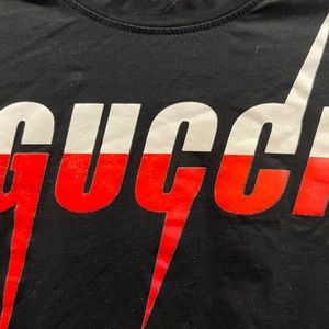 Gucci’s black Blade T-shirt has a bold logo printed across the chest in white and red. It's crafted in Italy from soft cotton jersey to a relaxed fit with dropped shoulders. Team it with printed jeans and trainers for laid-back weekend style.