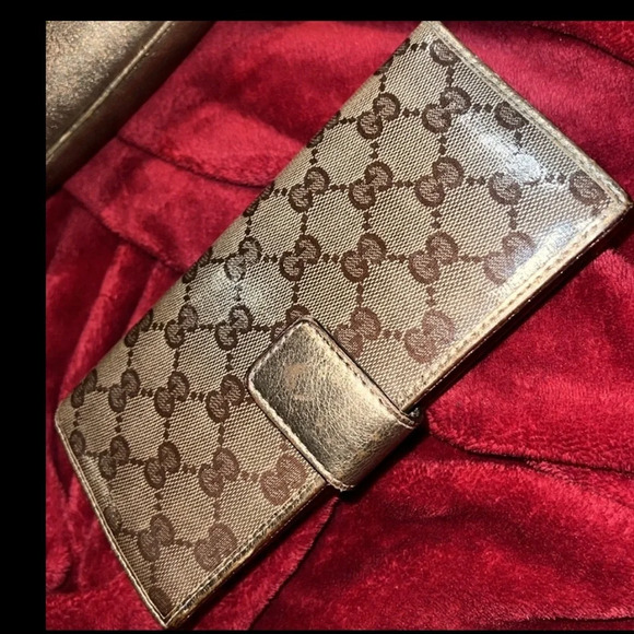 ⭐️🤎Stunning vintage style Authentic monogram canvas metallic tan gold gucci wallet preloved wear condition approx measurements photographed same day shipping from smoke free home