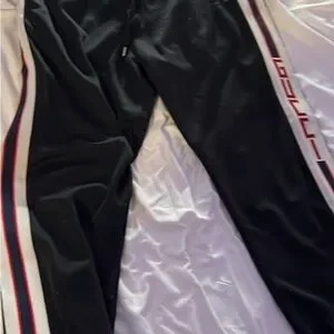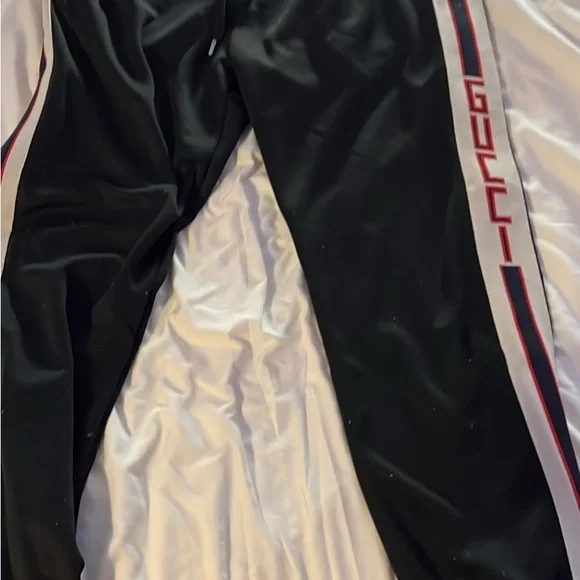 Elegant Gucci track pants in black. Features bold red and white stripes. Ideal for a sleek, modern style.