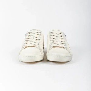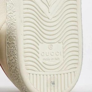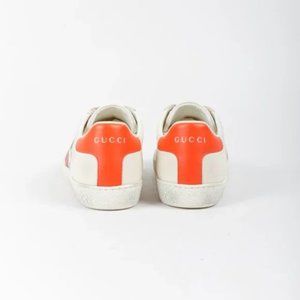 A fun pair of ivory Ace sneakers from Gucci in collaboration with Disney’s Mickey Mouse, featuring a round toe, flat rubber soles, lace fastenings, white leather lining and insoles, and orange leather trimmings on the heel that flaunt the Gucci name.