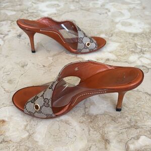 Authentic Gucci Vintage Beige/Brown GG Canvas, Leather & PVC Criss Cross Heeled Sandals in very good preowned condition with brand new heel caps done by professional shoe maker.
