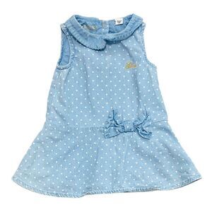 Isn't this cute? Light cotton denim dress with white polkadots, front waist bow and cute collar. Matching diaper cover is a total bonus piece that's going to look amazing all on it's own! Get this in your bundle with some sandals and hats for an adorable closet discount. EUC.