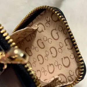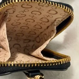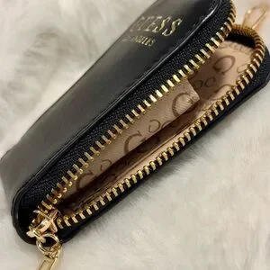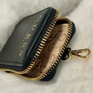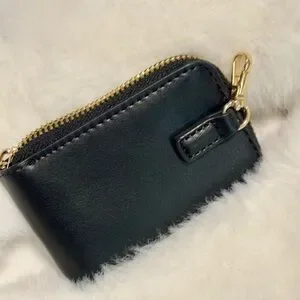 Small black leather coin purse with a zipper closure and a gold keychain.