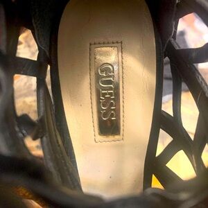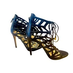 Stunning black cage heels by Guess. This style is called Anasia. Excellent used condition. This is a sexy Strappy high heel with a lace up feature in the front while also having a zip back for convenience. See measurement in the photo for heel height. Style #GWANASIA2 Size 6