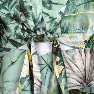 This dress by Guess has an satin exterior made of 100% polyester and a teal lining made of a polyester/elastane blend (90/10). The fabric pattern is tropical, accented by white foliage. The dress has short, flowy sleeves and a v neckline with a back zip and hook & eye closure. The midsection of the dress has a small peek-a-boo section with a tie above it (pics 3, 4). The skirt is flowy and falls above the ankle, but well below the knee. There is normal wear.