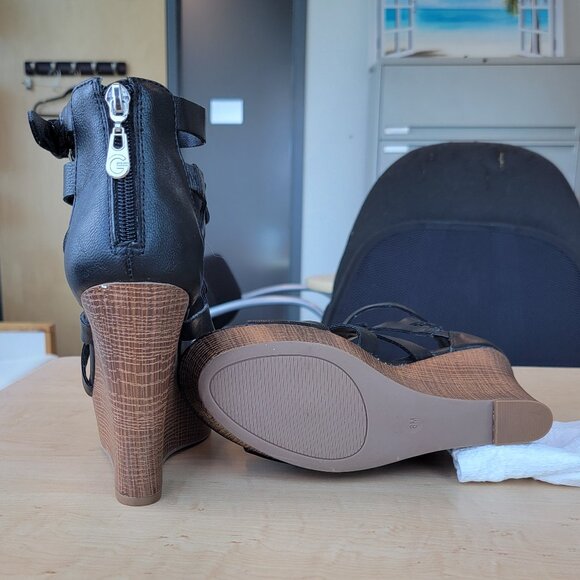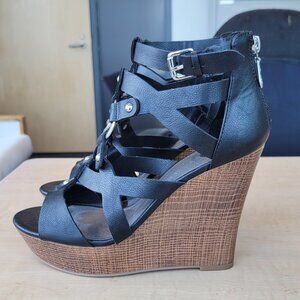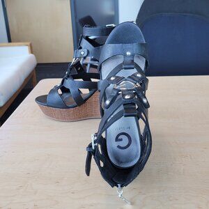 Feeling short? Then why not look taller with style with these Guess Black Dodge Wedge Zipper Back Heels. Open toe and open design of straps across the heel for breathablity, with the Guess symbol at the forefront.