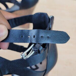 Featuring a two way process for removing and securing the heels to your feet which is through the buckle at the side (that has five holes for adjustability) and mini zip a the back of the heel.