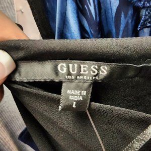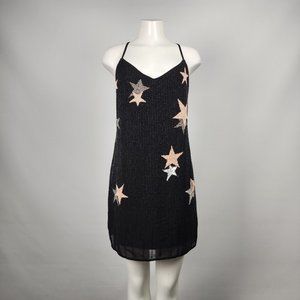 Chic black mini dress. Features star accents in silver and pink. Perfect for a night out.