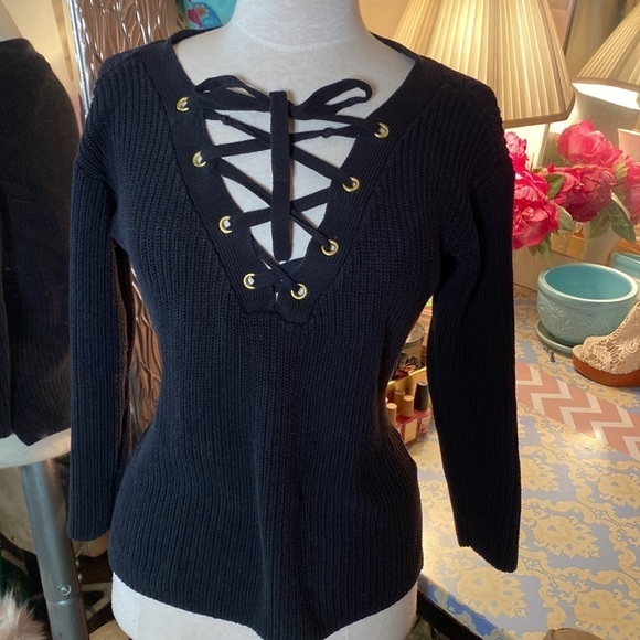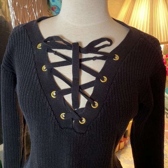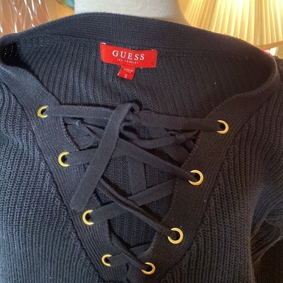 🌹Guess🌹 Black Ribbed Knit Lace Up V Neck Sweater