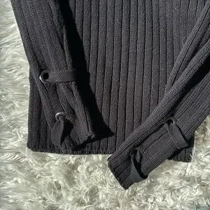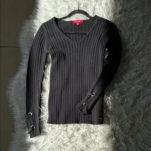 Elevate your style with this Guess black ribbed knit top. Perfect for any occasion, it features a sleek design with stylish details. A must-have addition to your wardrobe.