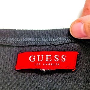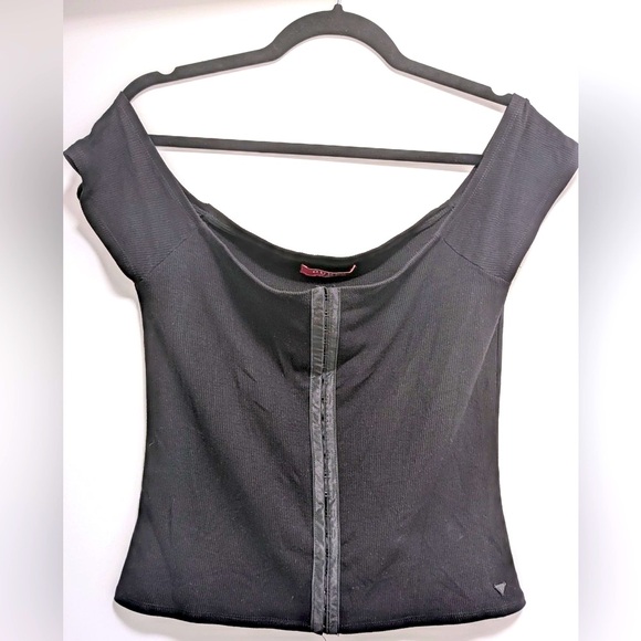 Guess off-the-shoulder sleeve ribbed top. Hook-eye front.