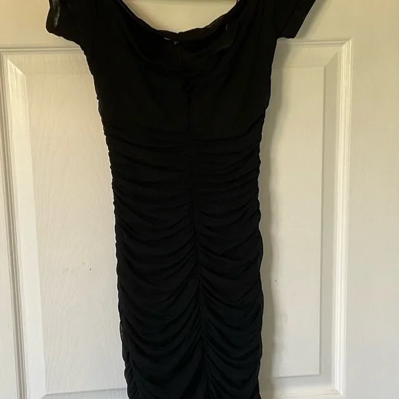Chic black mini dress with ruched detailing. Perfect for stylish outings.