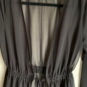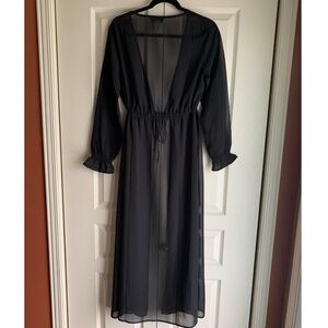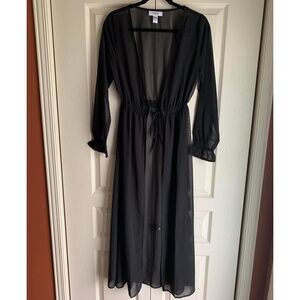 Elegant black sheer coverup. Long sleeves with tie front. Perfect for beach or poolside.