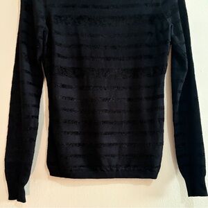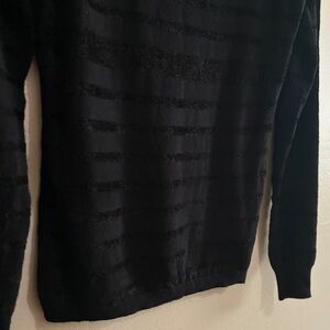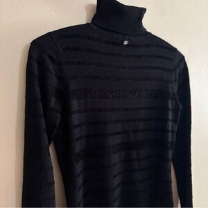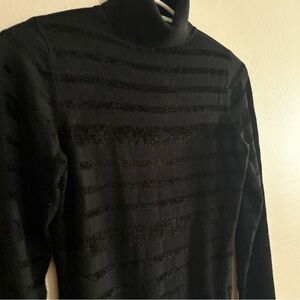Elegant black turtleneck sweater. Features subtle stripe pattern. Perfect for a chic look.