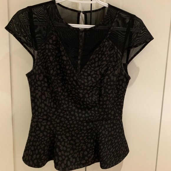 Guess Blouse, barely worn! In mint condition, size S. Mesh detailing on the top of the shirt, front and back. Peplum style. Zip up back with button at the top! Under layer is very soft and smooths everything well!