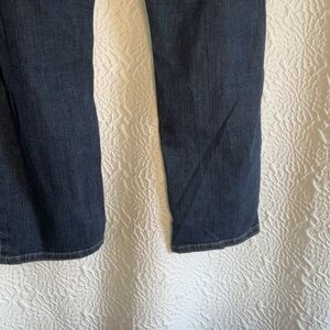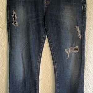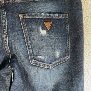 These Guess boyfriend jeans feature a classic blue wash with intentional distressing for a relaxed, casual vibe. The medium-dark denim is artfully faded, showcasing a vintage-inspired look with frayed areas and stylish rips. Perfect for a laid-back day, these jeans offer a comfortable fit with a trendy, lived-in appearance.