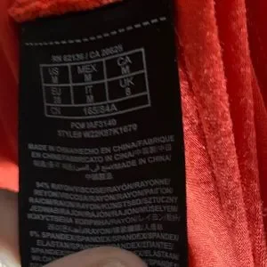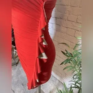 This dress has a nice orange and white rouche on the side. Stretchable and fitted. Perfect for a night out.