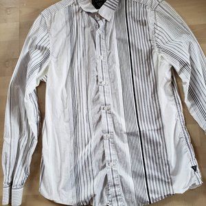 Guess Brand Slim Fit Mens long sleeved shirt, size Medium with black and grey striped design. Gently worn