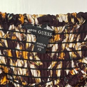 Guess smocked peasant style mini dress with floral pattern in Fall colours. Long sleeves and elegant design, size XS. In good pre-owned condition, laundered and ready to wear.