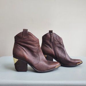 Brown western booties with brass at toe and on heel. Excellent condition. Never Worn.