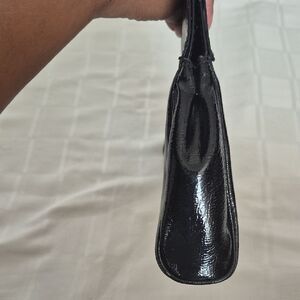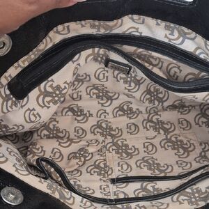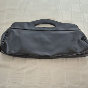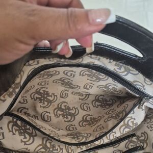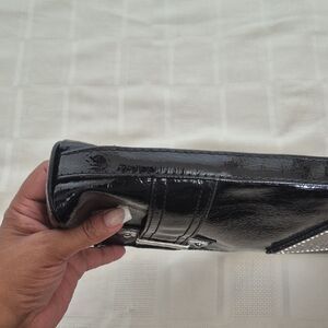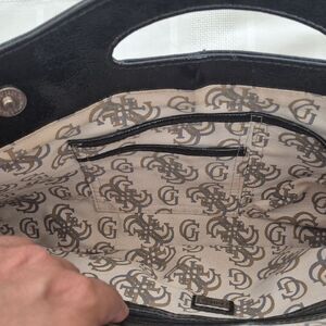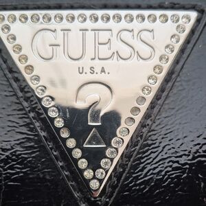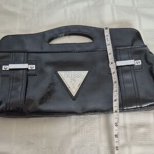Elegant black Clutch handbag with a glossy finish. Features silver accents and a signature Guess logo.