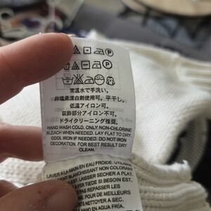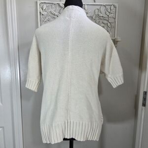 Stylish cream knit cardigan featuring intricate patterns and button details. Perfect for layering. Length 21" Width 18" Sleeves 9'
