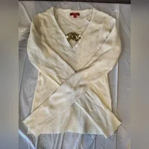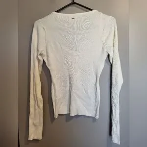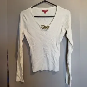 Guess Cream Ribbed V-Neck Top, Size Medium