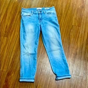 Guess crops, mid-rise, stretchy jean material.