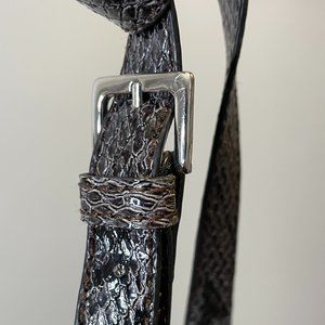 Fantastic little understated statement piece. It features a silver G logo, top zip closure, front envelope foldable closure on the outside, on the inside a cell phone pouch, card slots and a zip pocket. The colour is a mix of grey with a violet undertone with black accents. The length can slightly be adjusted, although more holes can be added with a hole puncher.
