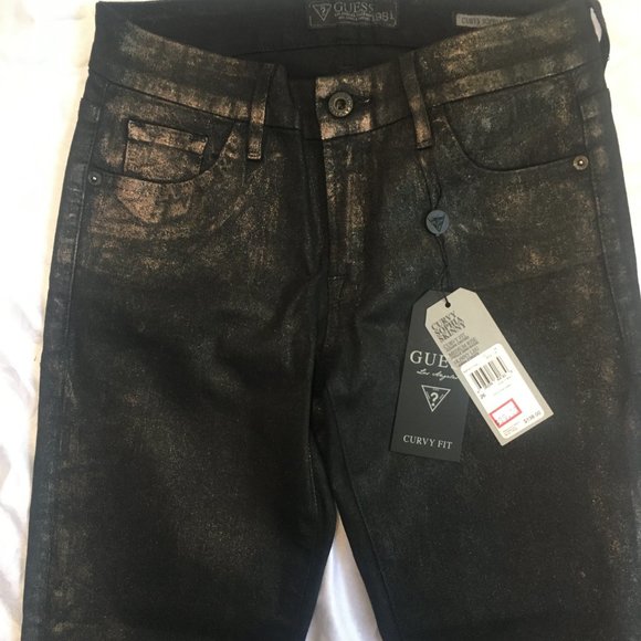 Guess Curvy Sophia Skinny Bronzer Wash Black Silver Shiny Jeans Size 26 Mid Rise