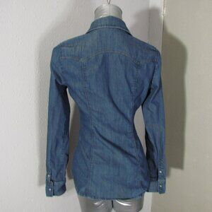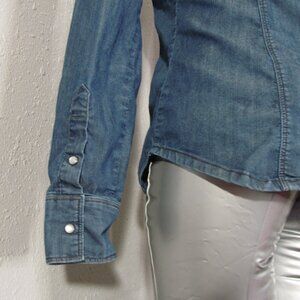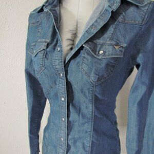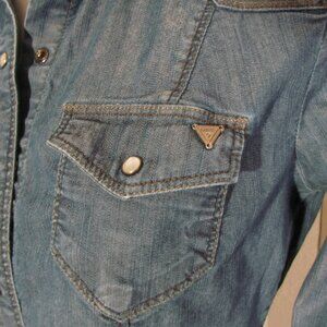 This classic Guess denim shirt is a versatile addition to any wardrobe, perfect for achieving that effortlessly cool, Western-inspired look. In excellent used condition.
