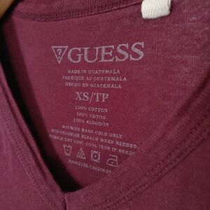 Guess | Dark red t shirt with black logo. pleae note then logo ia not super bold on the shirt. womans x small. 100% cotton .