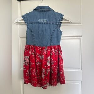Stylish dress with denim top and red floral skirt. Ideal for casual outings.