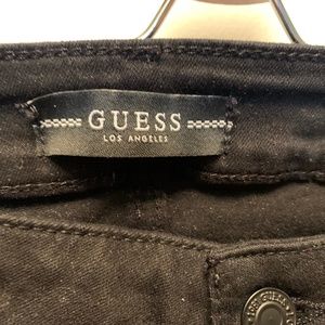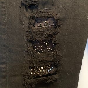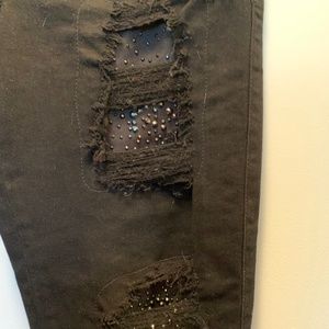 These have some bling to them but are also distressed. Have some stretch to them which makes them comfortable to wear. Mid rise. Waist measure 15 and can stretch to 17. Inseam 28". A cool pair of pants.