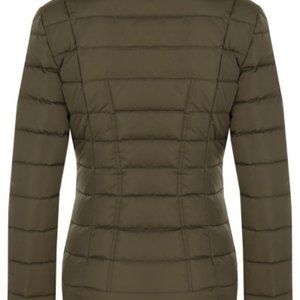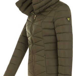 Beautiful, quilted olive-green Guess winter jacket with gold hardware. Sits at the hips. Very warm and cozy! Stand-up collar fastened with two-magnets and option of rolling up. Fuzzy warm two front zippered pockets. Left sleeve decorated with glittering detail. One inside pocket. Down with natural down and feather provides perfect thermal insulation in winter days.