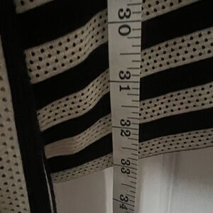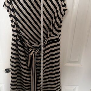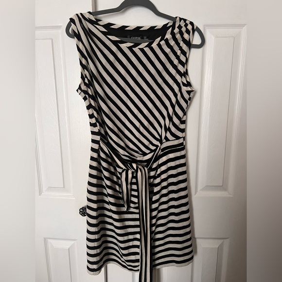 Black and cream, striped Guess dress with front tie. Size 12z. Good condition. Approx. 33 inches from neckline to bottom hem.
