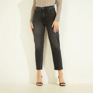 Every woman needs a staple pair of black jeans. Say hello to our Eco High-Rise Mom Denim Jeans In Authentic Black Wash! Perfect for pairing with a basic tee or your fave fashion top, these pants feature a full-length cut, high-rise fit, straight leg cut, GUESS logo detailing, a five pocket construction and a front button and zip fly closure.